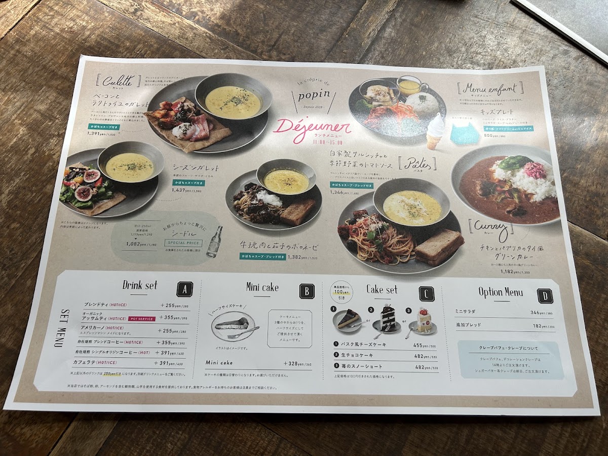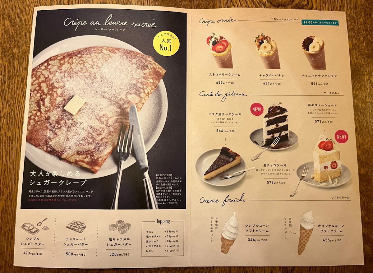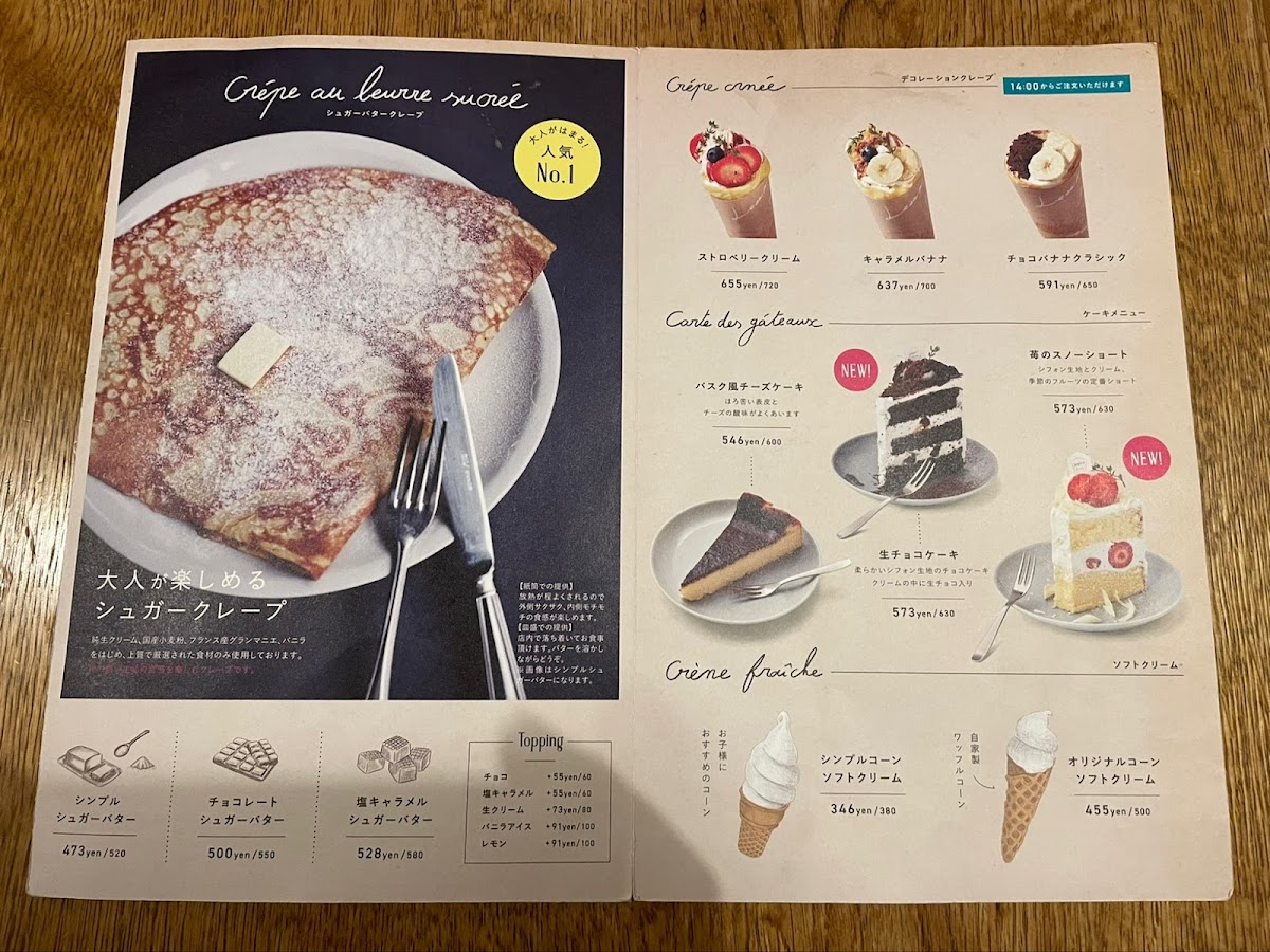 Drinks and café sides complete the experience smoothly, with カフェラテ providing a creamy, well-balanced coffee option that pairs effortlessly with both savory galettes and sweet crepes. Taken together, the menu reflects a clear identity: thoughtfully prepared dishes, a strong focus on galettes and desserts, and a sense of consistency that makes each item feel like it belongs. This careful balance between savory depth and sweet refinement defines the overall character of the menu and leaves a clear impression of a café that knows exactly what it wants to offer.